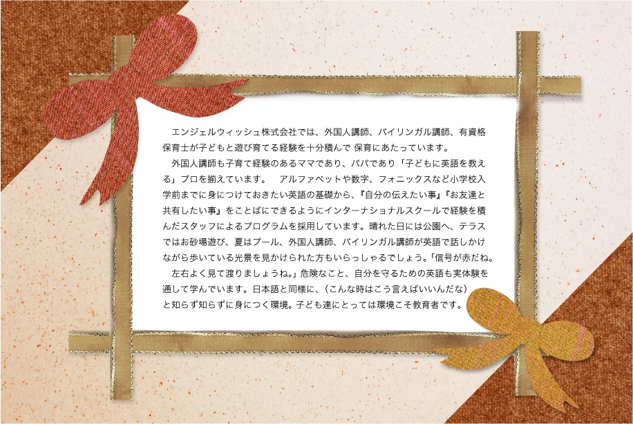 運営受託者 エンジェルウィッシュ株式会社 所在地 大阪府泉大津市春日町14-1 2020年7月7日移転 代表取締役 福西 麻弥 運営事業部 TEL:072-530-6026 E-mail:info@angelwish.info 事業内容 保育園の運営